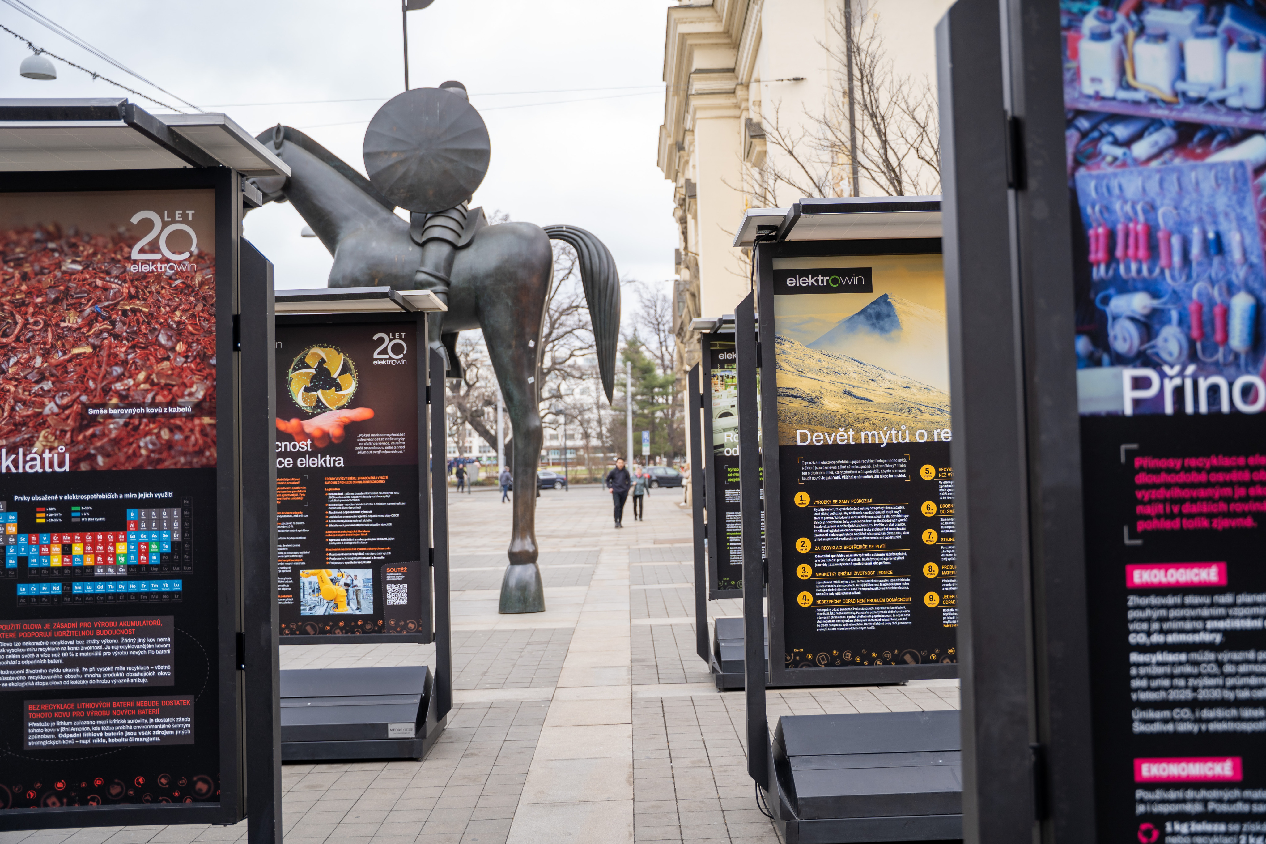 Nakonec zvítězila dvoustupňová varianta. První a základní stupeň představovala výstava s názvem „20 let Elektrowinu – recyklujeme pro budoucnost“ . Výstava se stala velkou výzvou pro značnou část zaměstnanců naší společnosti. Koneckonců v 15 zaměstnancích a 4 externích poradcích se to ani jinak uchopit nedá. Museli jsme v jednotlivých krajských městech zajistit povolení k umístění výstavy, což nebylo úplně jednoduché. Proto musím ocenit práci našich externích poradců, kteří díky skvělé spolupráci se zástupci odborů životního prostředí na krajských a magistrátních úřadech zajistili zábory na výbornou. Výjimku tvořila pouze Praha 1, která k našim žádostem přistoupila vyloženě destruktivně a na žádném z požadovaných míst nám výstavu neumožnila realizovat. Díky skupině Penta a Správě železnic se ale podařilo vyřešit i tento problém a výstava úspěšně proběhla na Masarykově nádraží, které díky četným dojíždějícím „mimopražským“ přirozeně propojilo návštěvníky výstavy z Prahy i Středočeského kraje, kterým byly věnovány dva panely výstavy.