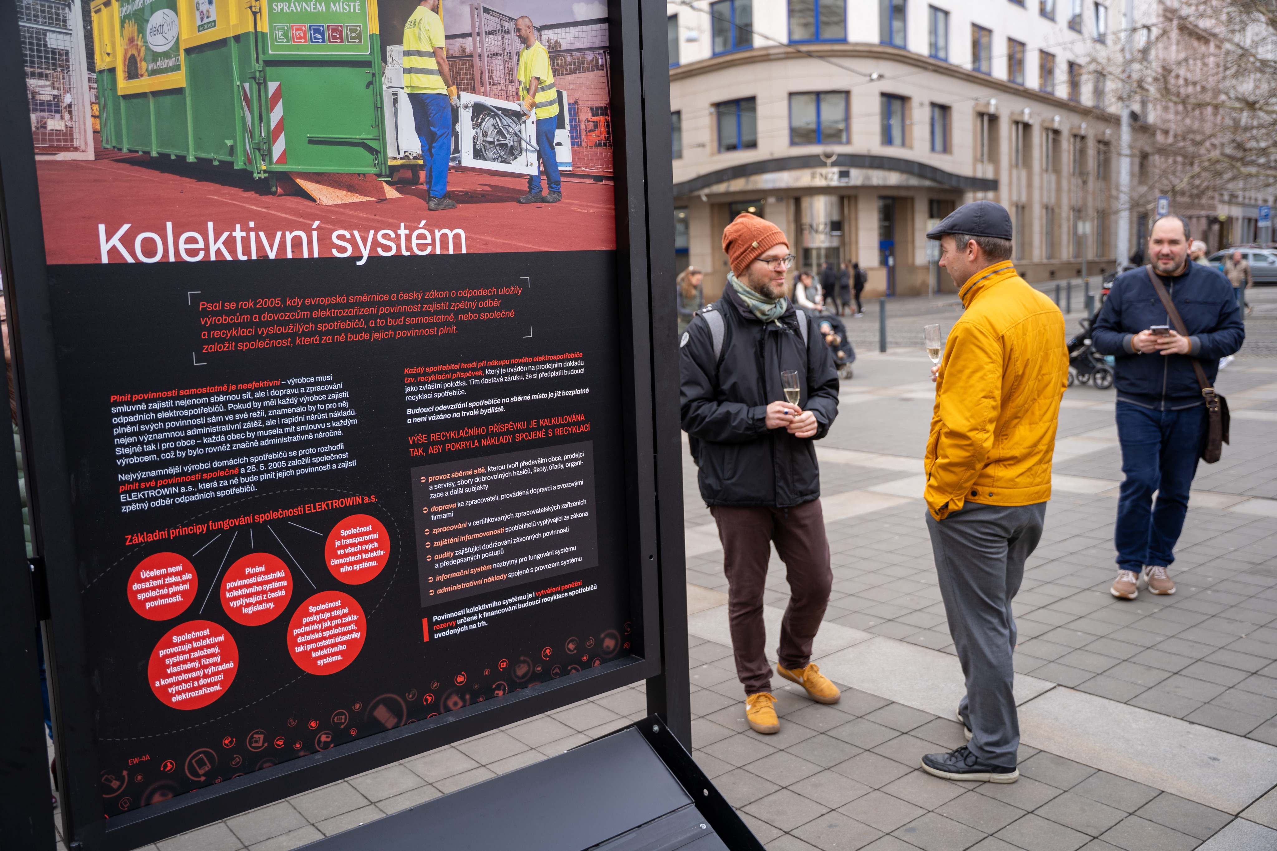 Dalším krokem bylo uzavření smlouvy s pronajímatelem 10 oboustranných výstavních panelů, což díky firmě Medialogue a jejím zkušenostem proběhlo během několika dní. Nasmlouvat panely je základem, ale naplnit smysluplným a atraktivním obsahem jednotlivé panely je jiný příběh. Do přípravy textů se zapojili nejen naši zaměstnanci, ale i spolupracující organizace – APPLiA, Ecobat, Národní technické muzeum. Mnoho podkladů jsme získali i díky našemu členství ve WEEE Foru.